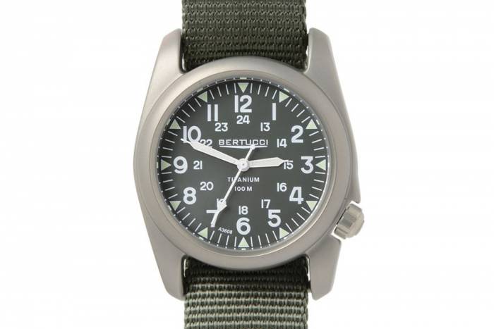 Bertucci’s A-2T titanium field watch fits great on smaller wrists. The 40mm crown is on the smaller side, but a high-contrast face makes it easily readable at a glance.